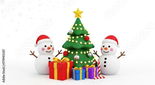 A festive christmas scene with snowmen, christmas tree and colorful wrapped gifts on a white background