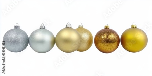 A festive display of six shimmering Christmas ornaments in various silver and gold tones, showcasing a blend of matte, glittery, and glossy finishes