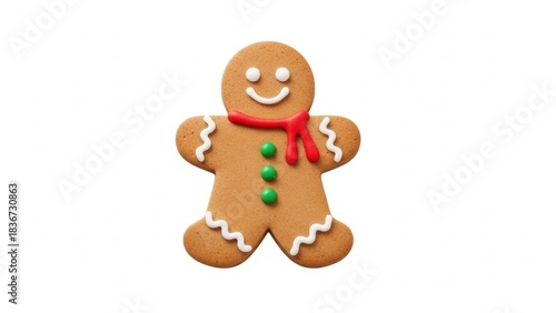 A festive gingerbread man cookie decorated with icing and candy buttons, wearing a red scarf.