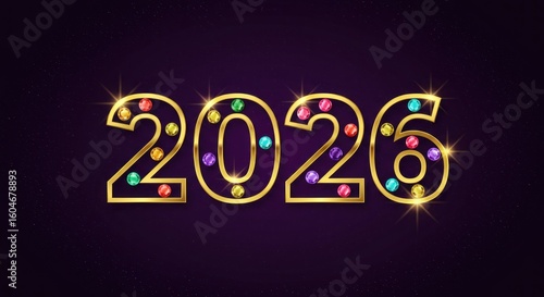 A festive, golden "2026" against a starry purple background. Each number is outlined in gold, with small colorful jewels inside, shining with light