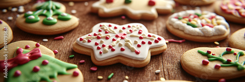 A festive holiday cookie decorating scene, with sugar cookies, icing, and sprinkles scattered around, showcasing a variety of shapes and designs.