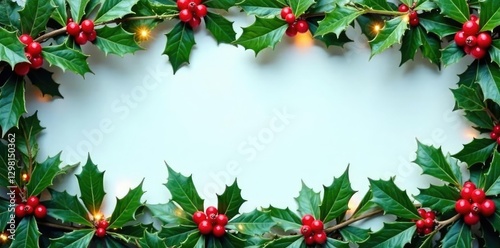 A festive holly bush in red berries and green leaves border, holiday, winter