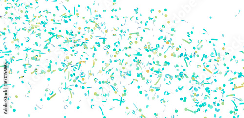 A festive image of teal and gold confetti falling on a white background, perfect for celebrations and parties.