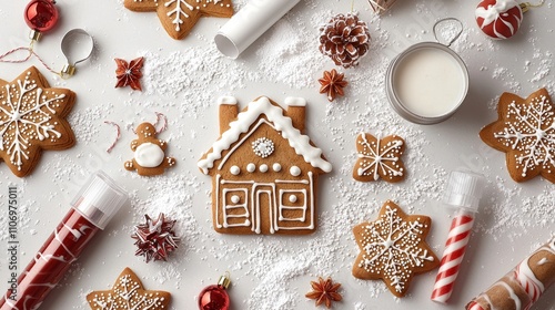 A festive kitchen countertop covered in gingerbread house cookies, icing tubes, sprinkles, and Christmas decorations, ready for assembling