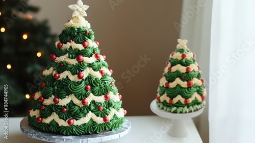 A festive pair of buttercream Christmas trees, one large and one small, adorned with red and white accents. A delightful holiday treat!