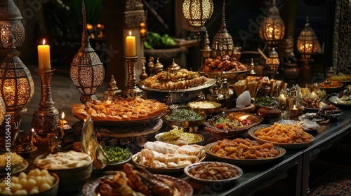 A festive Ramadan Iftar setup with decorative lanterns, candles, and an array of traditional dishes.