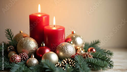 A festive red candle surrounded by sparkling Christmas ornaments, pine branches, and golden accents, creating a warm and joyful holiday atmosphere.