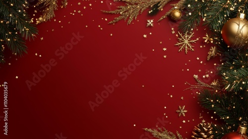 A festive scene adorned with lush fir branches, shimmering gold ornaments, and a rich red backdrop, capturing the essence of Christmas cheer and warmth.