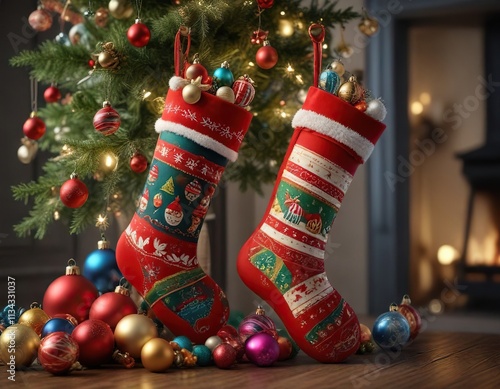 A festive stocking filled with colorful Christmas ornaments , merry motifs, evergreen branches, twinkling lights