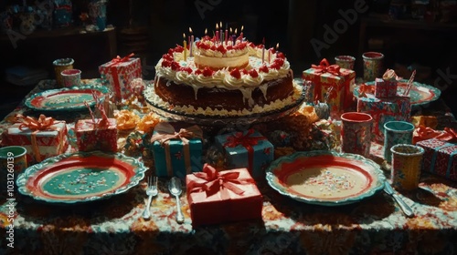 cake, candle, celebration, party, dessert, sweet, gift, wrapping, table, decoration, plate, fork, spoon, fruit, cream, frosting, colours, festive, joy, gathering, occasion, treat, sugar, icing, ribbon, snack, drink, cup, confetti, fun, family, friends, atmosphere, happiness, event, design, arrangement, holiday, cheerful, favor, indulgence, setting, serving, enjoyment, tradition, culture, memory
