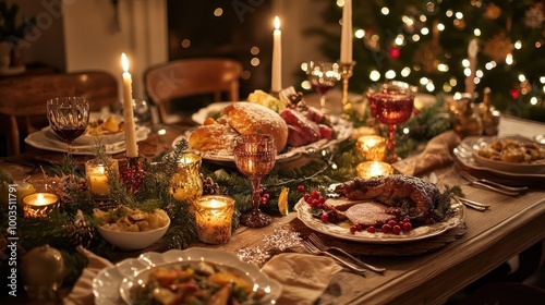 dinner, table, food, candle, holiday, christmas, roast, duck, bread, wine, glasses, plate, festive, silverware, setting, decoration, home, family, gathering, cosy, warm, rustic, celebration, tradition, togetherness, joy, happiness, love, delicious, hearty, centrepiece, elegant, beautiful, christmas tree, light, sparkle