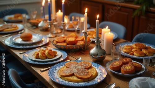 menorah, candle, cookie, pastry, celebration, winter, seasonal, family, togetherness, festive, table setting, food, home decor, holiday spirit, cosy, evening, family time, joyous occasion, food photography, festive season, generative, ai