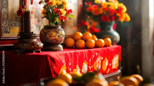 altar, decorated, offering, ancestor, home, chinese, new, year, blurred, background, copy, space, traditional, ceremony, celebration, family, cultural, symbol, respect, memory, honour, festival, occasion, ritual, warmth, atmosphere, setting, style, aesthetic, photo, image, stock, holiday
