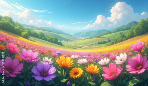 A field of flowers with a blue sky in the background.