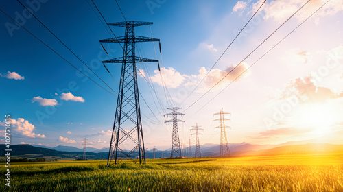 field, grass, tall, power, line, background, sky, electricity, blue, energy, cloud, transmission, voltage, tower, high, industrial, technology, supply, pylon, steel, wire, metal, cable, structure, distribution, environment, silhouette, engineering, equipment, volt, sunset, station, construction, danger, pole, grid, plant, generation, watt, substation, transformer, dusk, sunrise, landscape, evening, green, nobody, nature