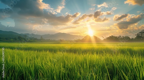 green, nature, field, agriculture, landscape, sky, farming, sunrise, sunset, grass, plant, summer, beautiful, sun, meadow, background, country, rural, cloud, rice, environment, season, sunlight, countryside, blue, paddy, food, morning, sunny, horizon, asia, harvest, spring, scenic, scene, farmland, land, growth