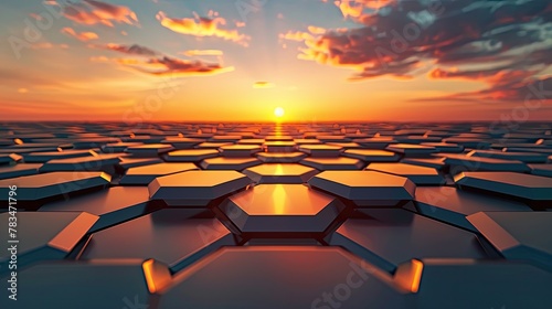field, hexagonal, solar, panel, capture, sunset, energy, green, electricity, renewable, vibrant, climate, platform, design, structure, control, module, reflect, reduce, transform, efficient, landscape, resource, harvest, produce, network, power, angle, sunlight