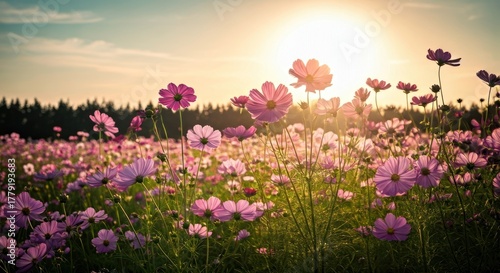 field, cosmos, flower, pink, sunset, gold, sun, tree, nature, bloom, sky, meadow, warm, light, beautiful, summer, outdoors, floral, landscape, blossom, flower petals, sunlight, horizon, serene, calm, peaceful, atmosphere, vibrant, green, grass, spring, day, evening, radiance, colours, view, wide, natural, fresh, growth, life, air, clear, gentle, tranquil, majestic, scene, rural, high-coloured