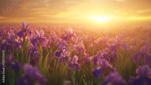 field, iris, purple, flower, sunset, light, gold, sky, meadow, bloom, blossom, nature, beauty, vibrant, delicate, soft, warm, glow, ray, landscape, summer, spring, floral, fragrance, picturesque, serene, tranquil, romantic, peaceful, harmony, outdoors, bright, high-coloured, green, foliage, background, botany, wild, plant
