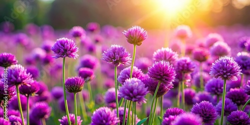 A Field of Vibrant Purple Flowers Basking in the Golden Glow of a Setting Sun