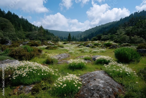 field, wildflower, tree, sky, clear, sun, nature, shining, summer, green, landscape, beauty, meadow, grass, mountain, view, hill, outdoors, forest, travel, tour tourism, scenic, park, spring, environment, hiking, vale, wild, sunny, flower, scenery, weather, season, bright, plant, scene, countryside, cloud, rural, panoramic, panorama, alpine, horizon, flora, peak, day, land, country, morning
