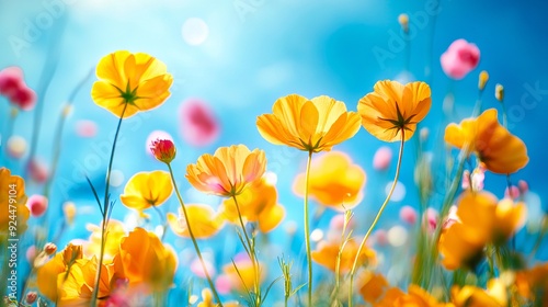 A field of yellow and pink flowers with a blue sky in the background