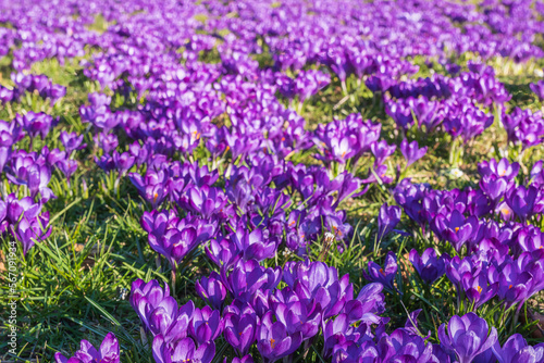 A field with violet flowering crocuses in a park in Wiesbaden/Germany