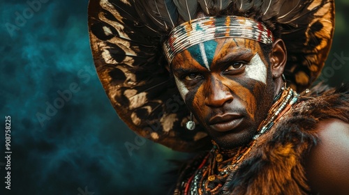 A fierce African tribal warrior showcases vibrant face paint and ornate headdress while engaging in cultural traditions and rituals