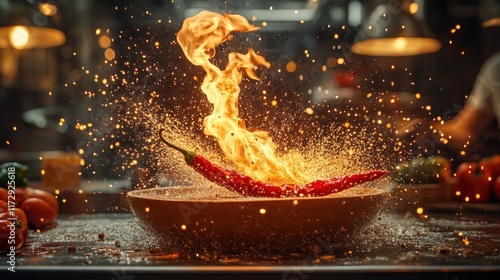 chili, fire, spice, cooking, kitchen, explosion, favor, heat, ingredient, culinary, food, preparation, vibrant, fresh, splash, excitement, energy, epicure, chef, receipe, passion, aroma, colours, texture, cookery, creativity, presentation, herb, vegetable, action, dynamic, savoury, zest, intense, sizzling, colourful, delicious, feast, meal, organic, natural, artistry, smoke, flames, seasoning, freshness, plating