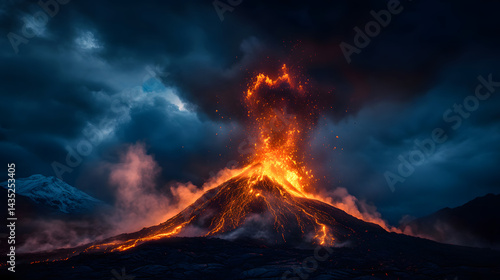 fiery, eruption, molten, lava, fountain, sending, high, sky, glowing, ember, dramatic, explosion, light, heat, power, wild, terrain, intense, nature