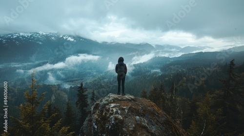 figure, stand, windy, mountain summit, facing, taking, stunning, sprawling, forest, distant, peak, person