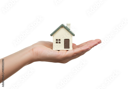 A figurine of a house in the palms of a woman. Dreaming of your own home. Homeownership. Achieving stability, building equity, and creating a safe space for family memories and milestones.
