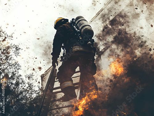 A firefighter ascends a ladder amidst smoke and flames, showcasing bravery and emergency response.