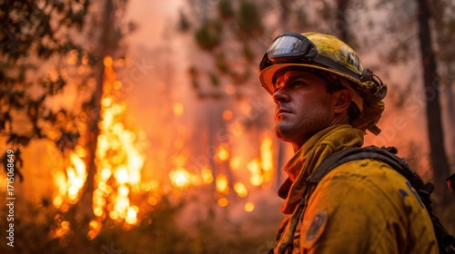 A firefighter in protective gear surveys a raging wildfire as flames and smoke engulf the forest backdrop. The intense heat and fire create a dramatic atmosphere during the emergency response.