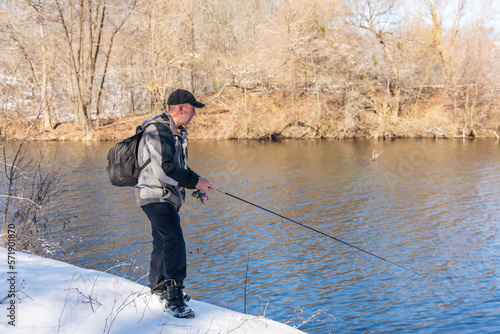 A fisherman with a fishing rod and a backpack catches fish on the bank of a snow-covered river