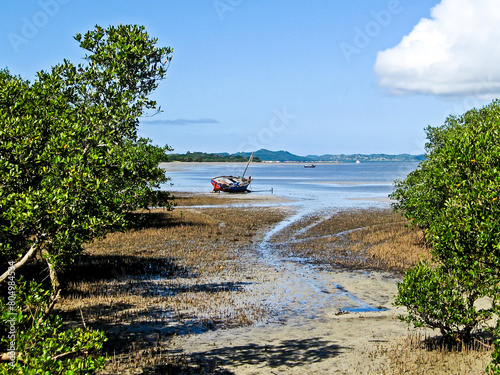 A fishing dhow moored on the edge of a calm, sheltered, bay in the Inhaca Barrier Island system, Mozambique, as seen from the fringing Mangrove forest.