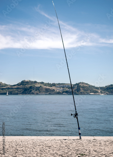 A fishing rod standing along the Lisbon riverbank of Tagus river near the Belem tower at sunset. Fisherman lifestyle