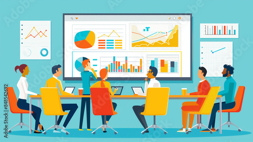 A flat illustration of a Team brainstorming session around a large screen displaying charts and graphs, flat illustrations, business, office, with copy space
