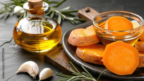 sweet potato, olive oil, garlic, rosemary, food, wooden board, rustic, fresh, vegetable, healthy, cooking, ingredient, natural, orange, kitchen, culinary, raw, preparation, dark background, receipe, nourishment, vegetarian, vegan, organic, garnish, healthy eating, aromatic, herb, spice, natural food, food photography, fresh produce, savoury, sliced, homemade, table, delicious, wholesome, cooking oil