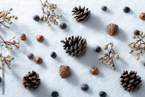 A flat lay of various generic small pinecones and dried berries scattered on a snowy white background, creating a winter tableau.