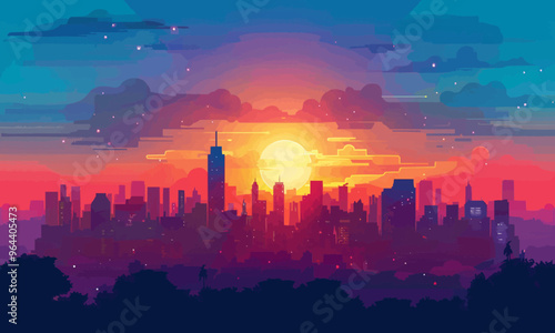 A flat vector of a cityscape at sunset.