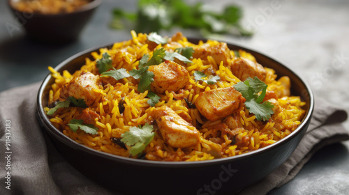 A flavorful Indian dish featuring spicy chicken cooked with aromatic basmati rice.