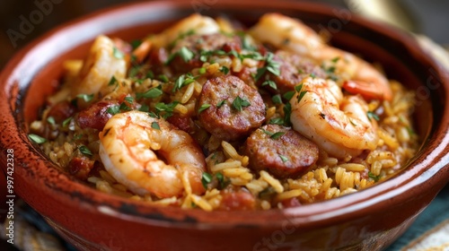 A flavorful jambalaya filled with shrimp, sausage, and rice, presented in a vibrant dish with herbs sprinkled on top.