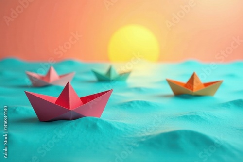 A fleet of colorful paper boats gracefully navigate a tranquil ocean under a vibrant sunset