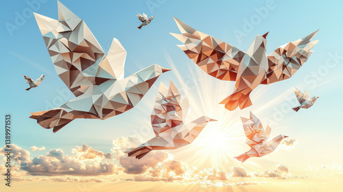 A flock of origami birds soars through a vibrant blue sky, their white and brown forms contrasting beautifully with the clouds and the radiant sun.
