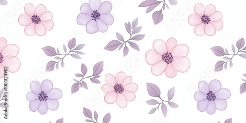 A floral pattern featuring pink and purple flowers with leaves on a white background.