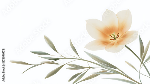 A flower with green leaves is in the foreground of a white background
