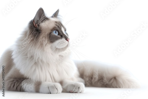 A fluffy cat relaxing on a clean white surface. Ideal for pet and animal-themed designs