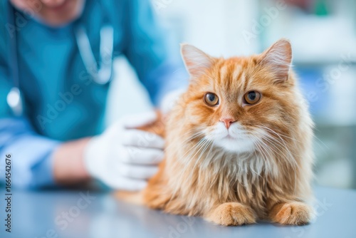 A fluffy orange cat is examined by a veterinarian in a clinical setting, focusing on the cat's calm expression and soft fur