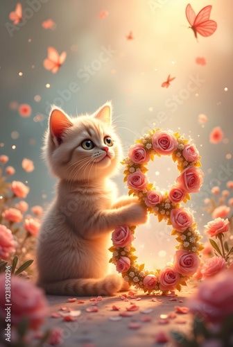A fluffy white kitten playfully touches a glowing floral number eight, surrounded by roses and butterflies in a soft, dreamy setting